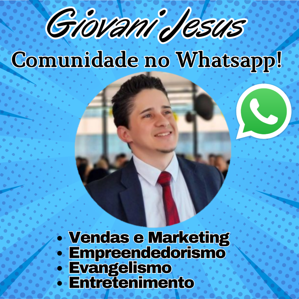 Faça parte da minha Comunidade no Whatsapp- FIQUE TRANQUILO, POIS NÃO É GRUPO (ninguém ter acesso ao seu número e ficar te enviando mensagens no particular sem sua permissão ou em Chat aberto); ou seja somente EU enviarei os comunicados com Promoções Exclusivas, Links dos Novos vídeo do Youtube, áudios de Empreendedorismo, Evangelismo (Mensagens Bíblicas) e em breve conteúdos de Entretenimento!